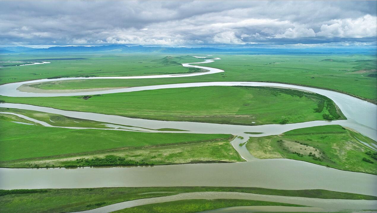 这里地势平坦,水流舒缓,河面宽而蜿蜒,曲折河水分割出无数河洲、小岛。