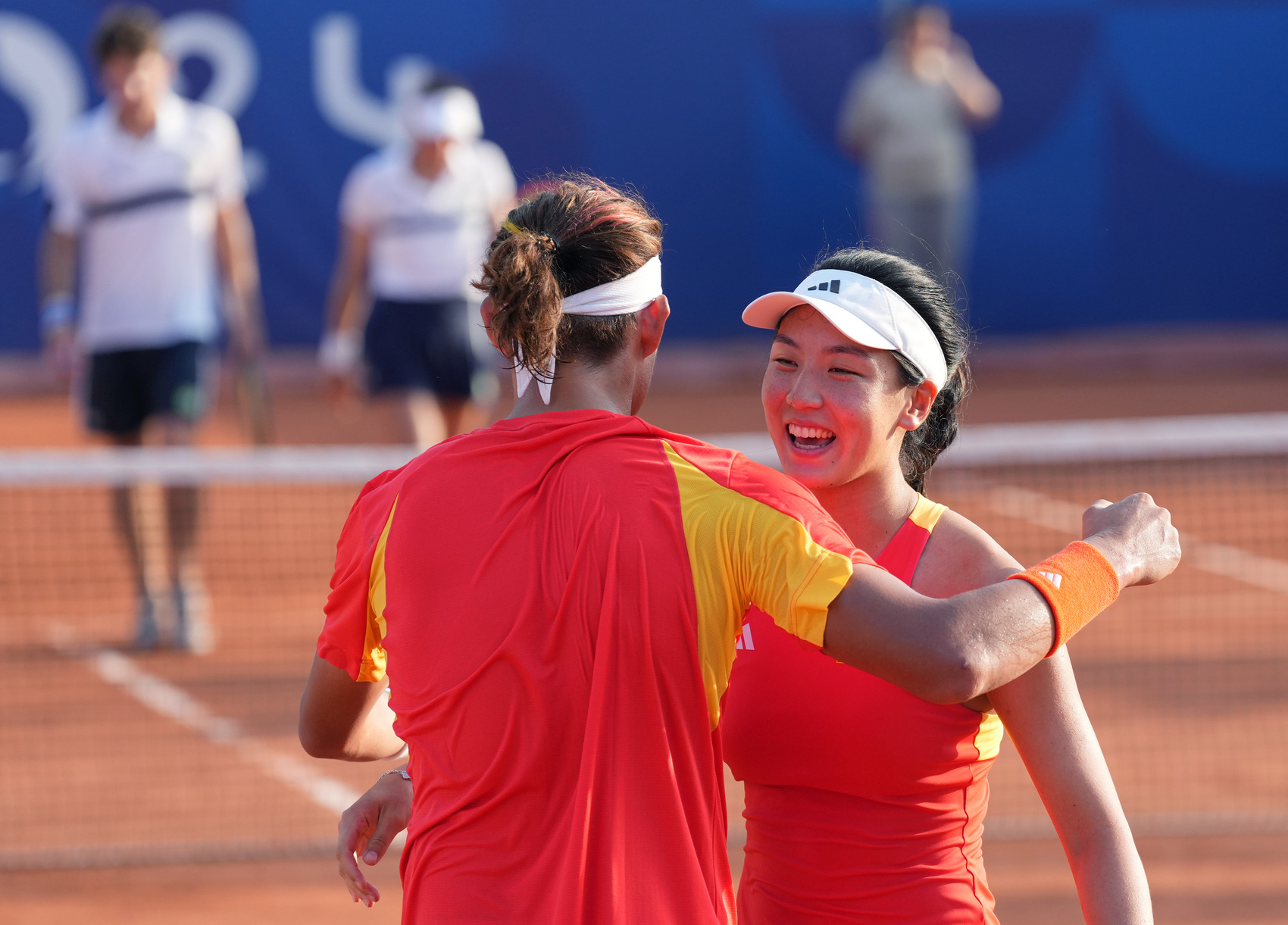 7月30日,中国组合王欣瑜(右)/张之臻在比赛中庆祝。新华社记者 万象 摄