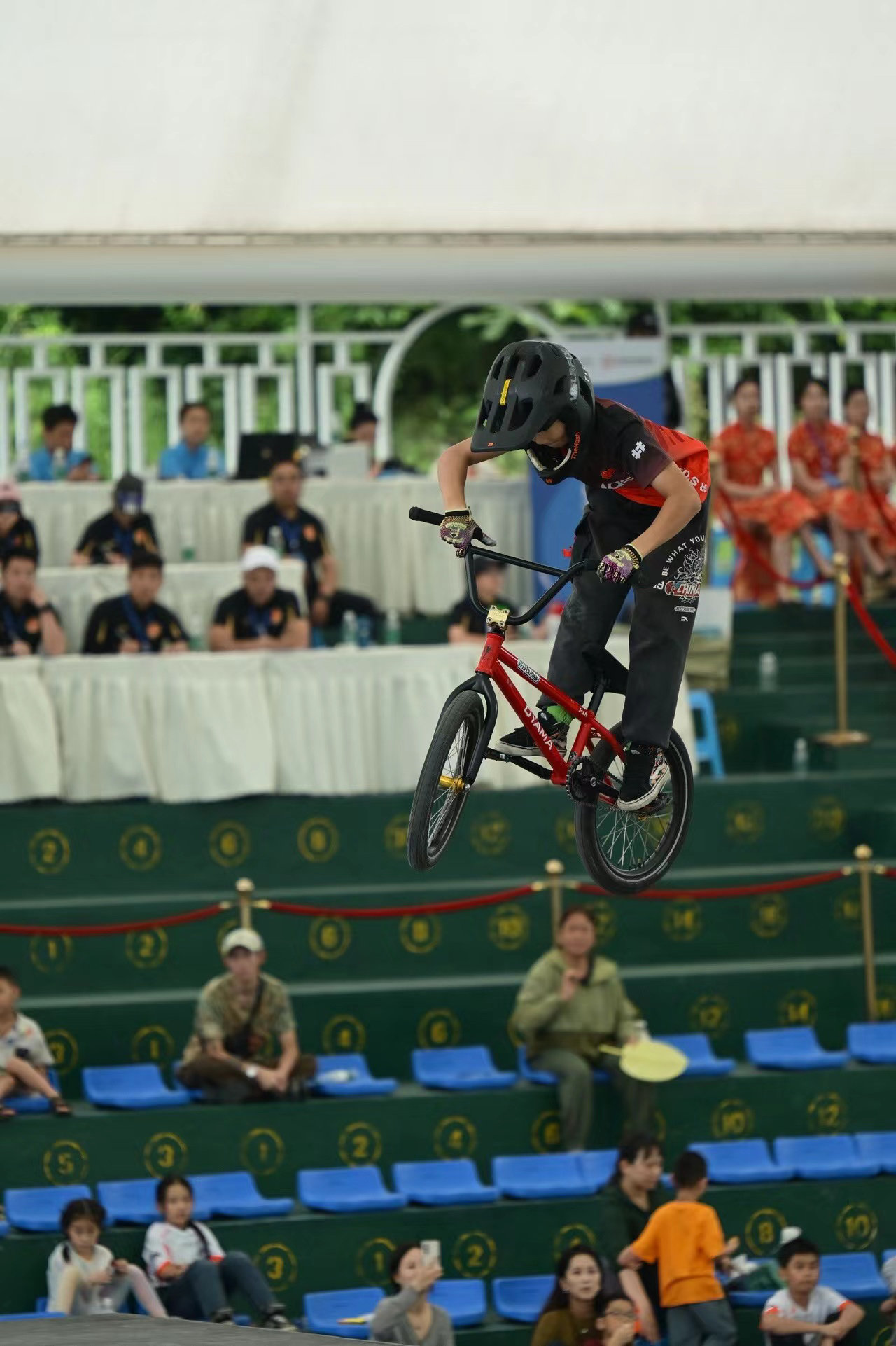 当天,运动选手就2024全国青少年U系列自由式小轮车冠军赛决赛展开激烈角逐。随着裁判一声令下,一名又一名选手依次上场,如离弦之箭从高台俯冲而下,随之又顺场地斜坡冲上空中,悬空翻转,从180度到720度华丽展现运动身姿,神龙摆尾、鱼跃龙门......各种充满中国式浪漫的招式名字都被参赛选手一一演绎出来。