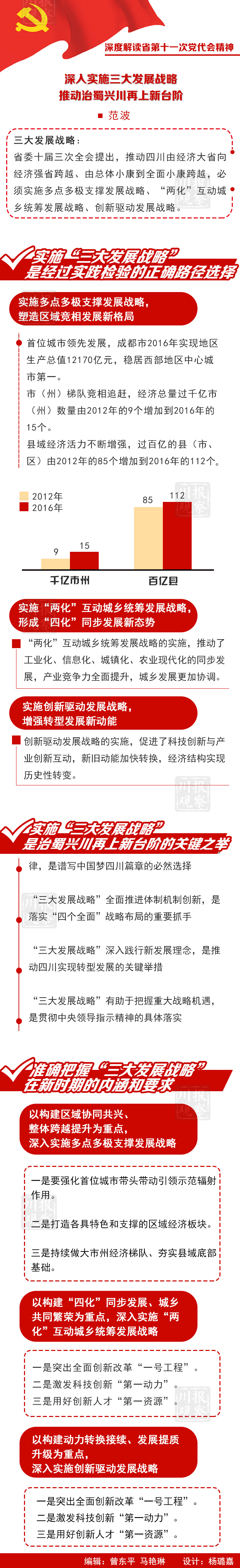 四川省委十届三次全会提出,必须实施多点多极支撑发展战略、“两化”互动城乡统筹发展战略、创新驱动发展战略。五年来,省委、省政府带领全省上下深入实施“三大发展战略”,推动四川经济社会发展取得显著成就。