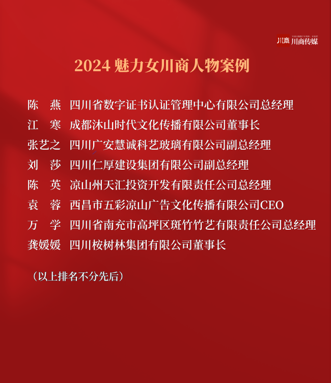 据介绍,“川商年度人物案例”发布活动由政协四川省委员会经济委员会、四川省政府国有资产监督管理委员会、四川省经济合作局、四川省工商业联合会、四川省妇女联合会、四川日报报业集团等省级相关部门指导,川商杂志社(川商传媒)主办,四川中科华航科技集团有限公司首席战略合作,绵阳市商业银行支持。