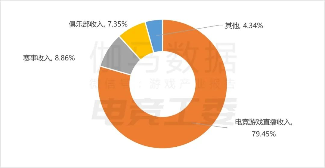 在中国音像与数字出版协会的统计口径中,电竞产业收入不包括游戏产品本身的销售收入,主要统计直播、赛事、俱乐部及其他收入。从收入板块来看,主要收入来源为电竞游戏直播收入,占比达79.45%;赛事、俱乐部和其他收入分别占比8.86%、7.35%和4.34%。上述统计板块收入相较去年均略有上升。