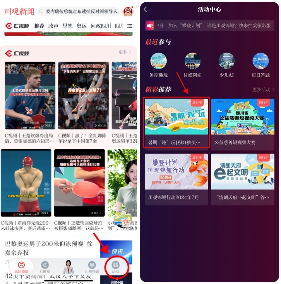 2.在川观新闻首页,点击右下角“活动”,进入活动中心,找到暑期“趣”玩活动图片,点击即可参与活动;