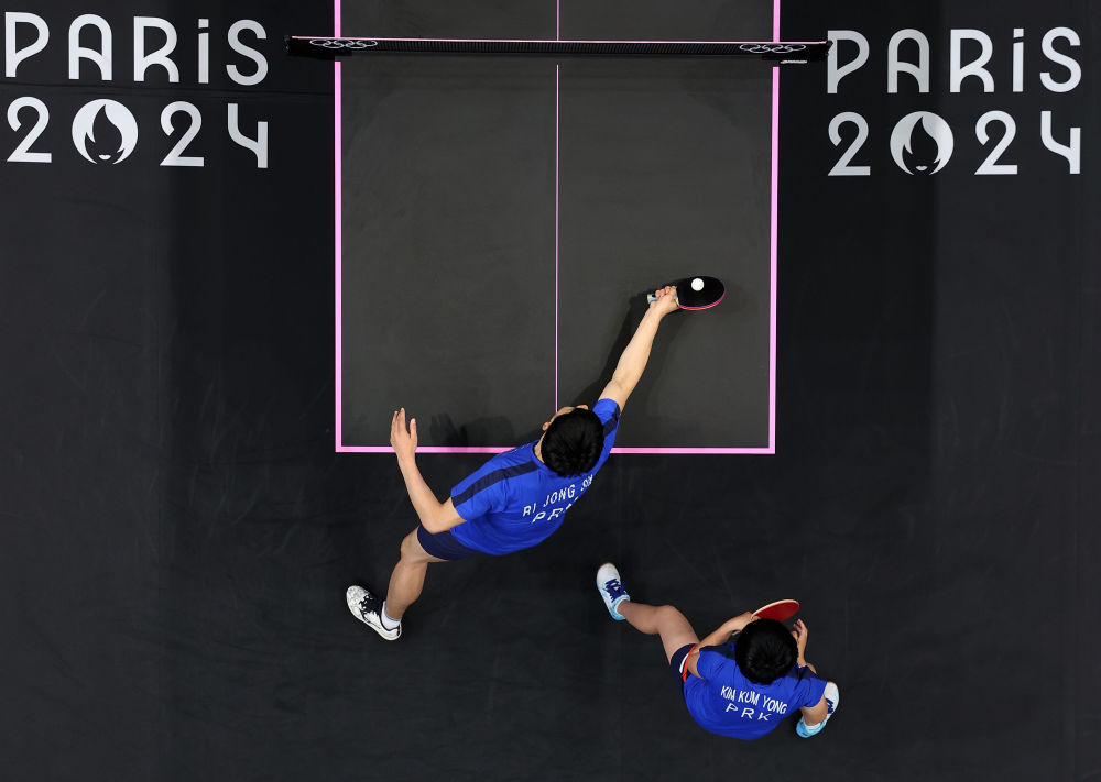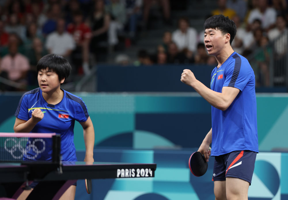 ↑7月30日,朝鲜组合李正植(左)/金琴英在比赛中。新华社记者郭昱摄