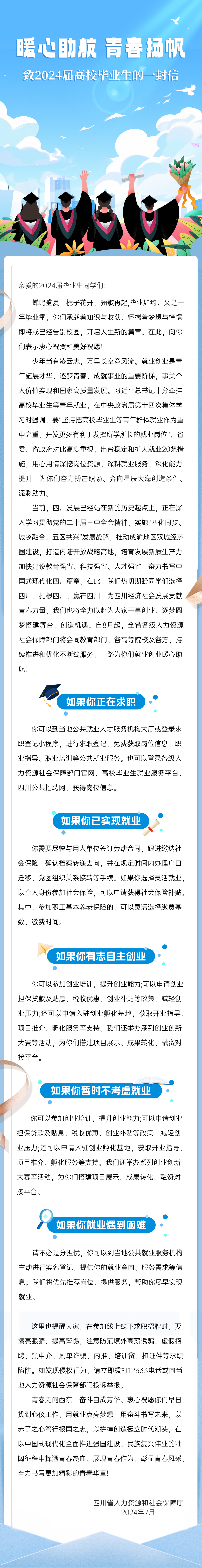 7月31日,为帮助高校毕业生就业,四川省人力资源和社会保障厅发布《致2024届高校毕业生的一封信》。信中介绍,自8月起,全省各级人力资源社会保障部门将接棒教育部门和各高等院校,协同各方,持续推进和优化不断线服务,一路为2024届高校毕业生就业创业暖心助航!