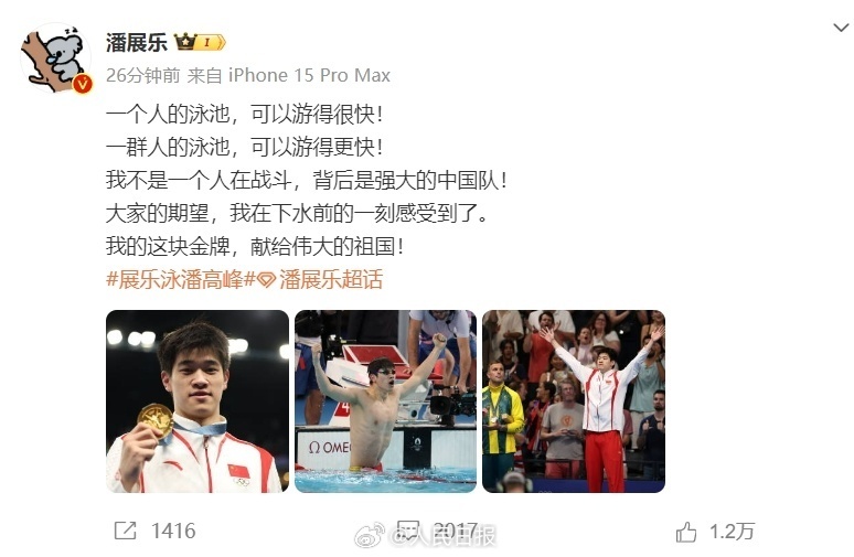 男子100米自由泳,潘展乐破纪录夺金,赛后他发博称:“我不是一个人在战斗,背后是强大的中国队!我的这块金牌,献给伟大的祖国!”祝贺!