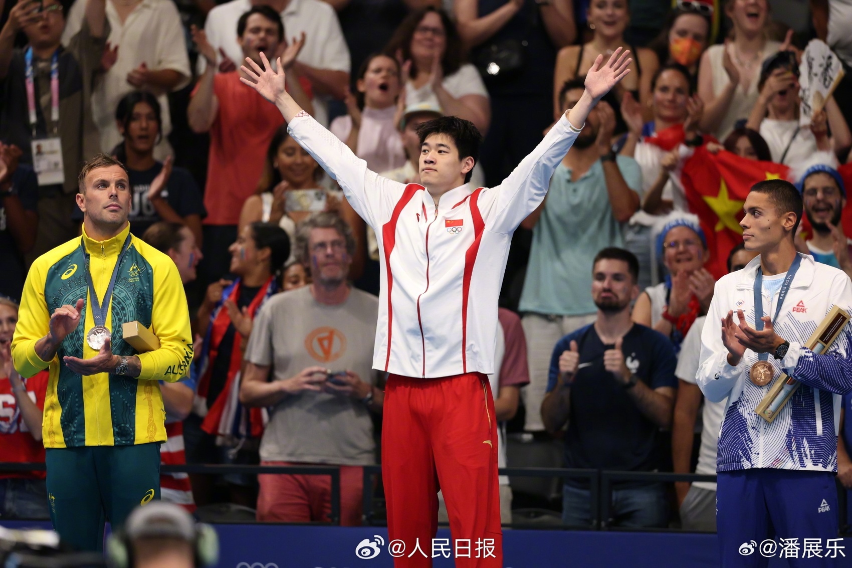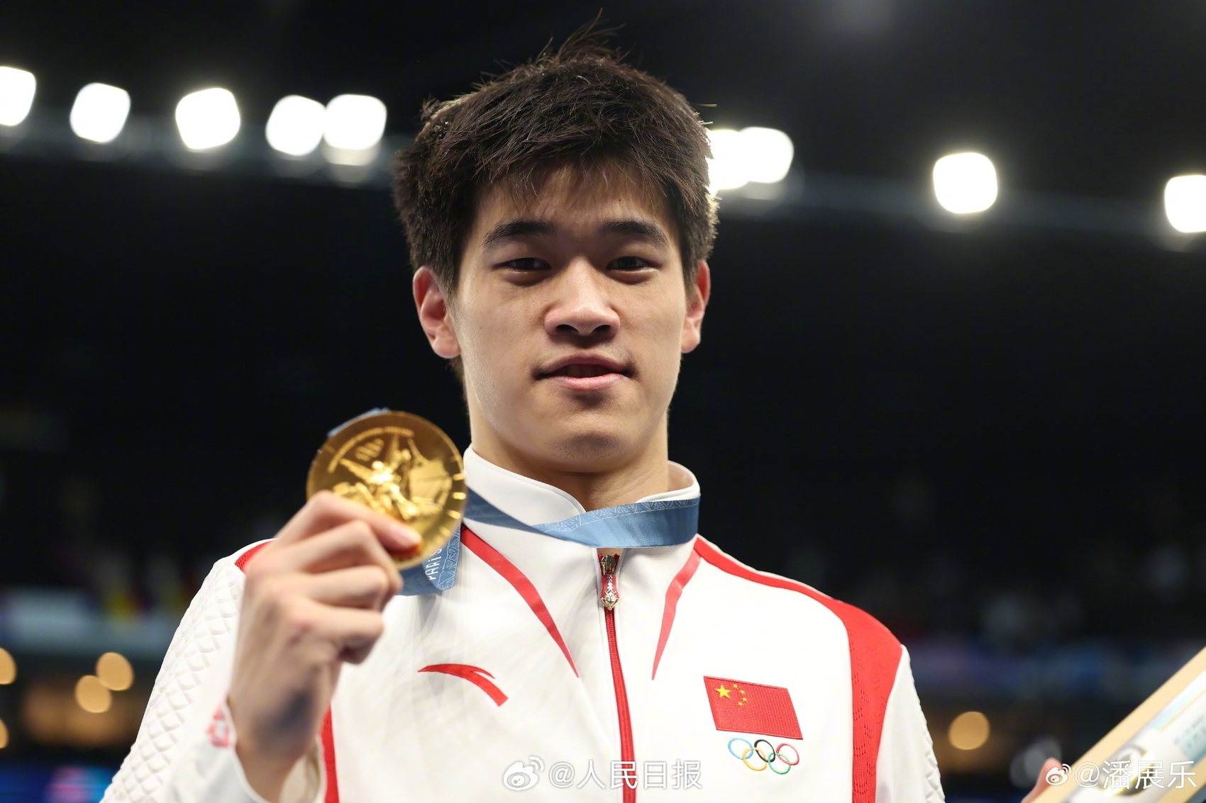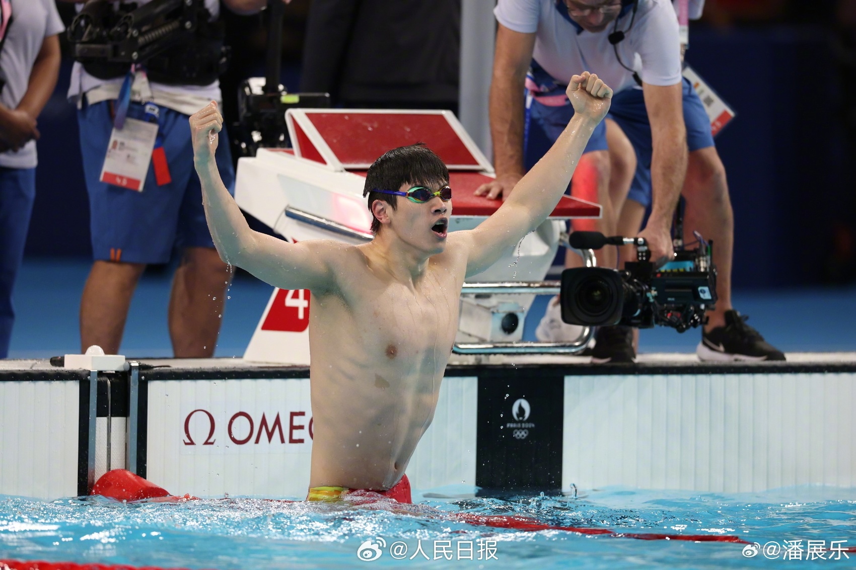破记录的金牌,超水平的发挥,中国男子游泳第一金,可喜可贺,祝贺潘展乐,乐不可支,金牌献祖国。