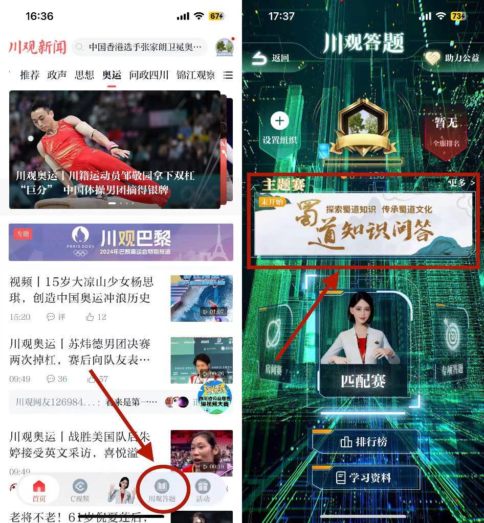 方式二:在川观新闻首页,点击下方“川观答题”,找到蜀道知识问答活动图片,点击即可参与活动;