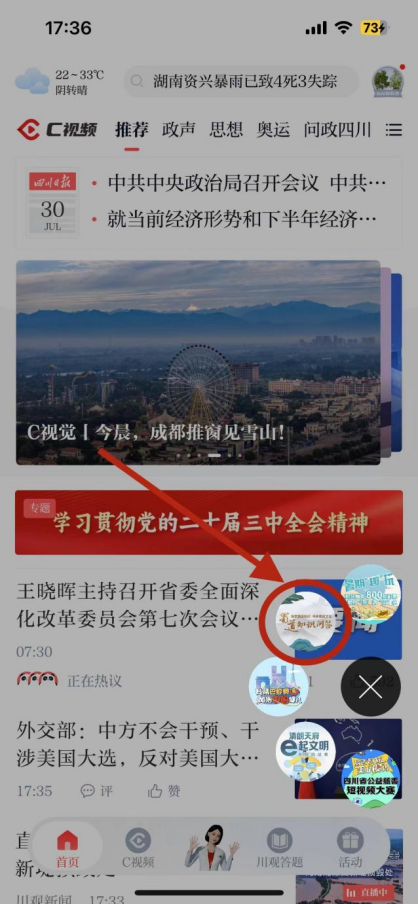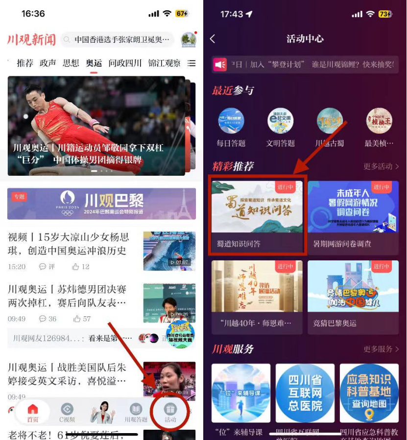 方式三:在川观新闻首页,点击右下角“活动”,进入活动中心,找到蜀道知识问答活动图片,点击即可参与活动;