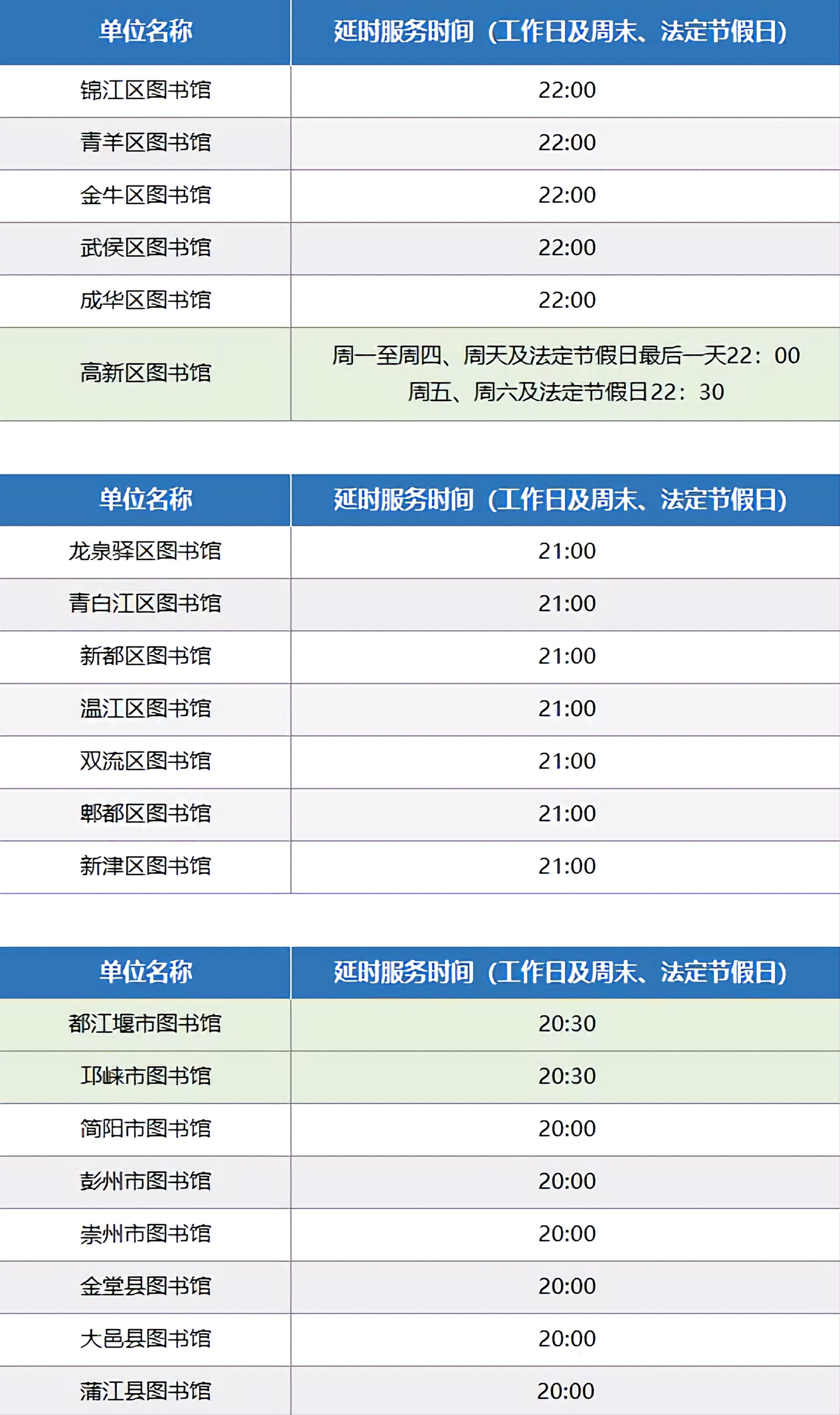 为持续优化全市公共文化设施服务供给,不断丰富夜间文化生活,满足人民群众对美好文化生活的新期待,8月1日起,成都市所有县级公共图书馆将开启延时开放服务。