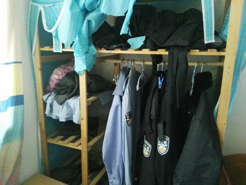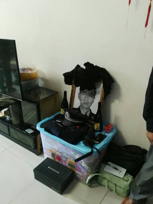 贾巴伍各的遗像和警服。地上新买的一双皮鞋,伍各一直舍不得穿。