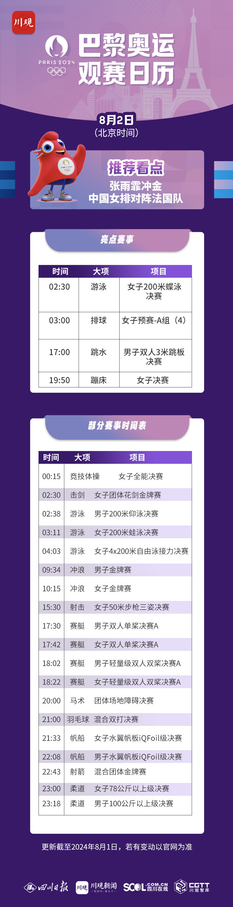 ▷8月2日,部分亮点赛事已在凌晨完赛,跳水继续双人项目的争夺,中国队派出了龙道一/王宗源参加男子双人3米板;蹦床比赛将决出女子个人的金牌。羽毛球项目将产生首枚金牌。郑思维/黄雅琼将出战混双决赛,力争实现中国羽毛球队金牌开门红。