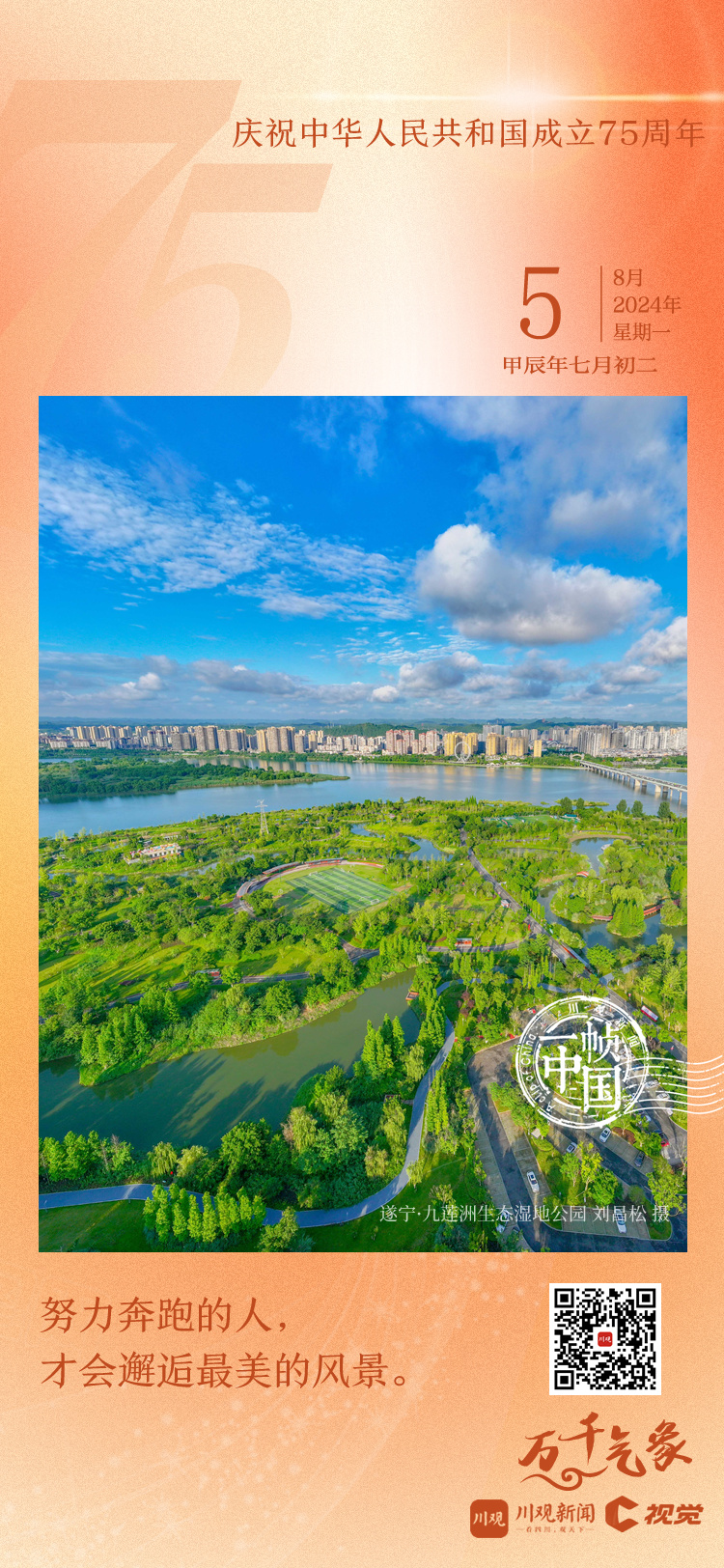 今天距离2024年国庆节还有57天,川观新闻《一帧中国》带你来到遂宁,畅游绿意盎然的九莲洲生态湿地公园。