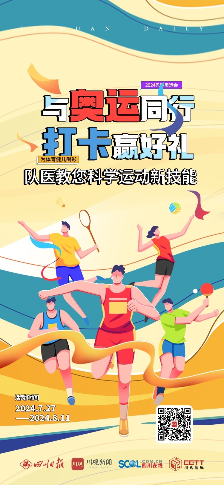 7月27日至8月11日,川观新闻携手四川省骨科医院、成都体育学院附属体育医院推出“与奥运同行,打卡赢好礼”活动,每天都有专业医生与您分享科学运动新技能。