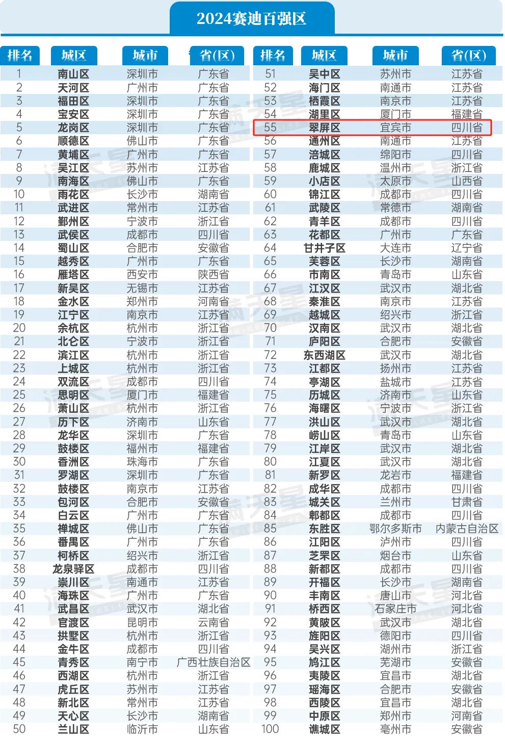 翠屏区从2020年首次入围全国百强区、排名第68位,到2024年跃升至第55位,连续4年实现跃升进位。目前是全省除成都市辖区外最高排位、居全省第5。