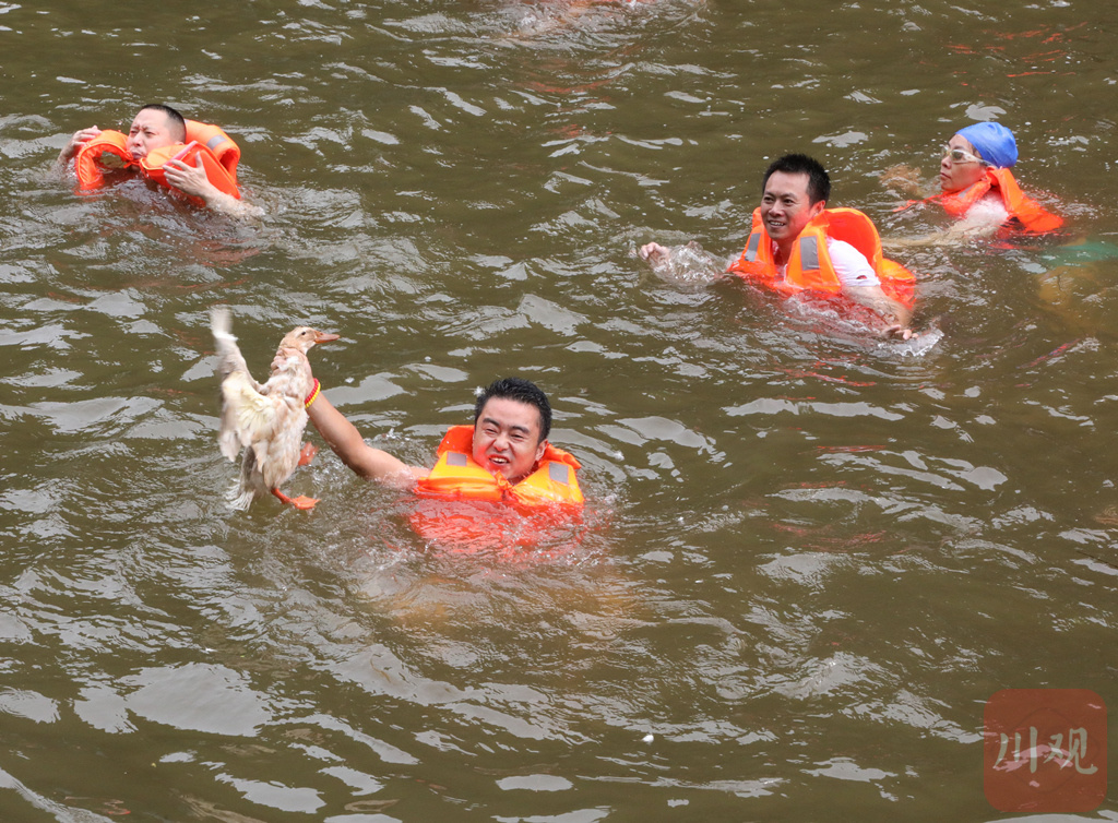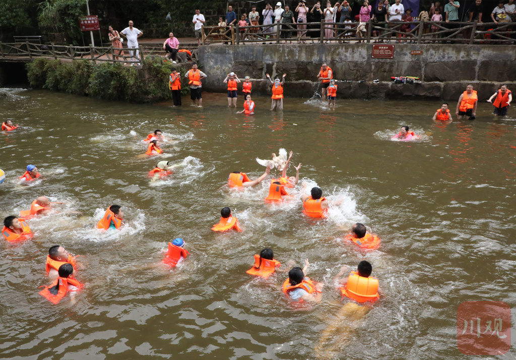 周末漂流结束后,景区的抢鸭子活动更是热闹非凡。随着活动的开启,一只只肥美的鸭子纷纷入水扑腾,游客们赤手空拳,朝着鸭子奋力扑去。现场的呼喊声、欢笑声以及鸭子的嘎嘎叫声相互交织,共同构成了一幅充满活力与欢乐的动人画面。资阳游客张格一家听说有抢鸭子活动,便赶来参与,“真的是非常刺激、非常好玩,我们收获颇丰,一家人抢到了两只鸭子。”