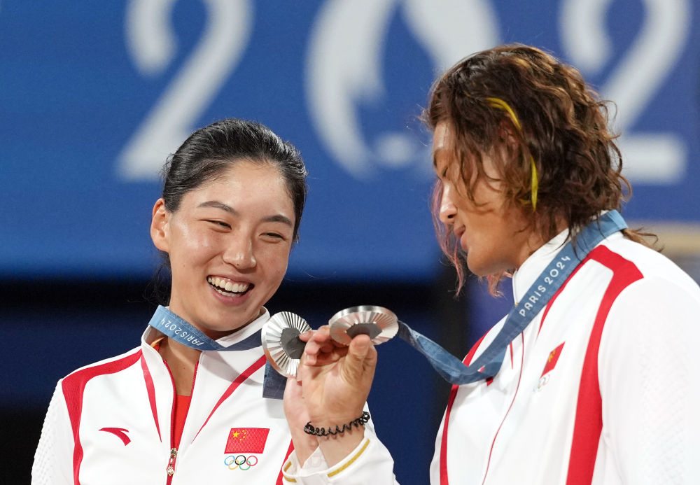 8月2日,银牌得主中国组合王欣瑜(左)/张之臻在颁奖仪式上。新华社记者 万象 摄