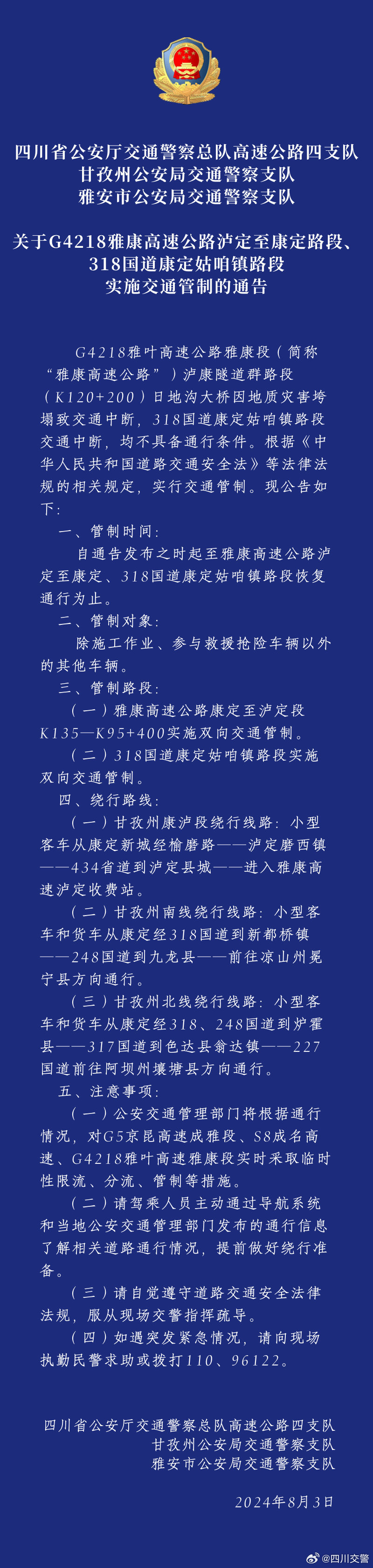 8月3日14点30分,记者从四川省公安厅交警总队获悉,因G4218雅叶高速公路雅康段(简称“雅康高速公路”)泸康隧道群路段(K120+200)日地沟大桥因地质灾害垮塌致交通中断,318国道康定姑咱镇路段交通中断,均不具备通行条件。根据《中华人民共和国道路交通安全法》等法律法规的相关规定,实行交通管制。公告内容如下: