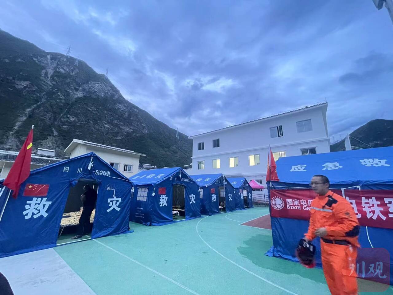 8月3日20时许,记者在康定市姑咱镇郎鼓村临时安置点看到,工作人员正在安装应急救援床,多顶救灾帐篷已经搭建了起来,帐篷内灯火通明,有被褥和折叠床等物资。村民已吃完晚饭,开始休息。