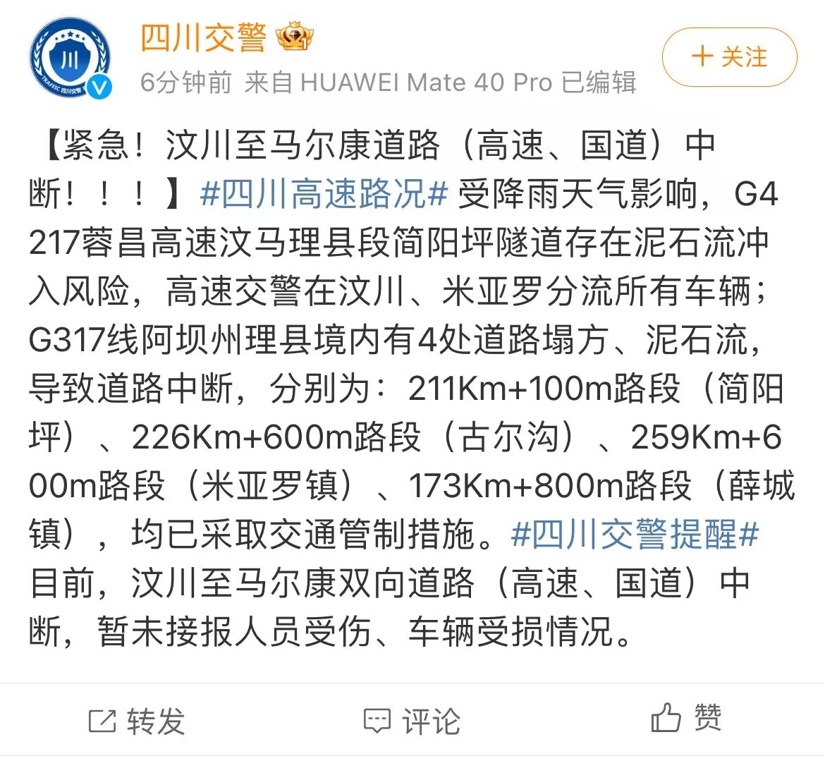 四川交警提醒,目前,汶川至马尔康双向道路(高速、国道)中断,暂未接报人员受伤、车辆受损情况。