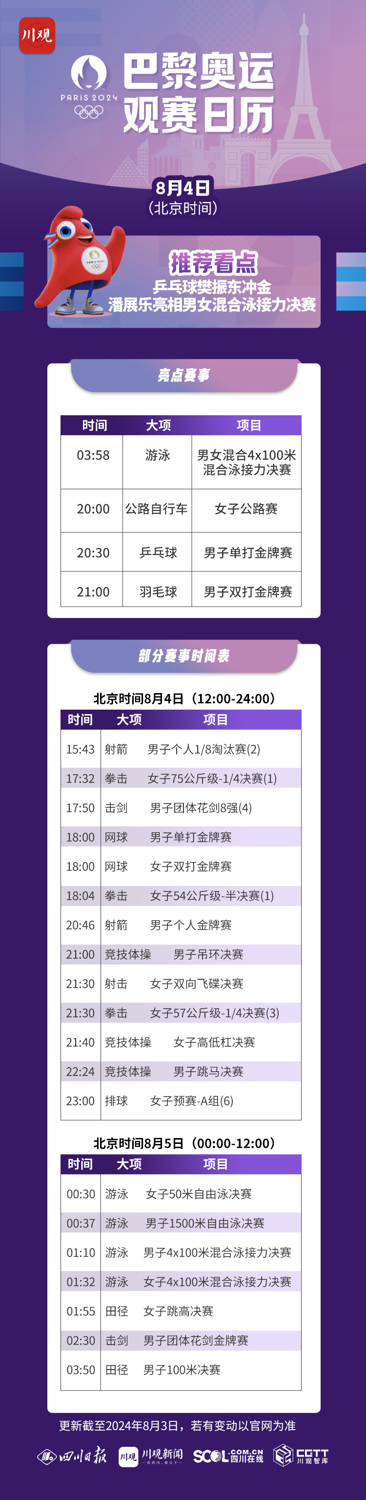 ▷关注今日看点。乒乓球男单决赛,中国选手樊振东对阵瑞典选手莫雷加德,樊振东将向金牌发起冲击。(北京时间4日20:30)