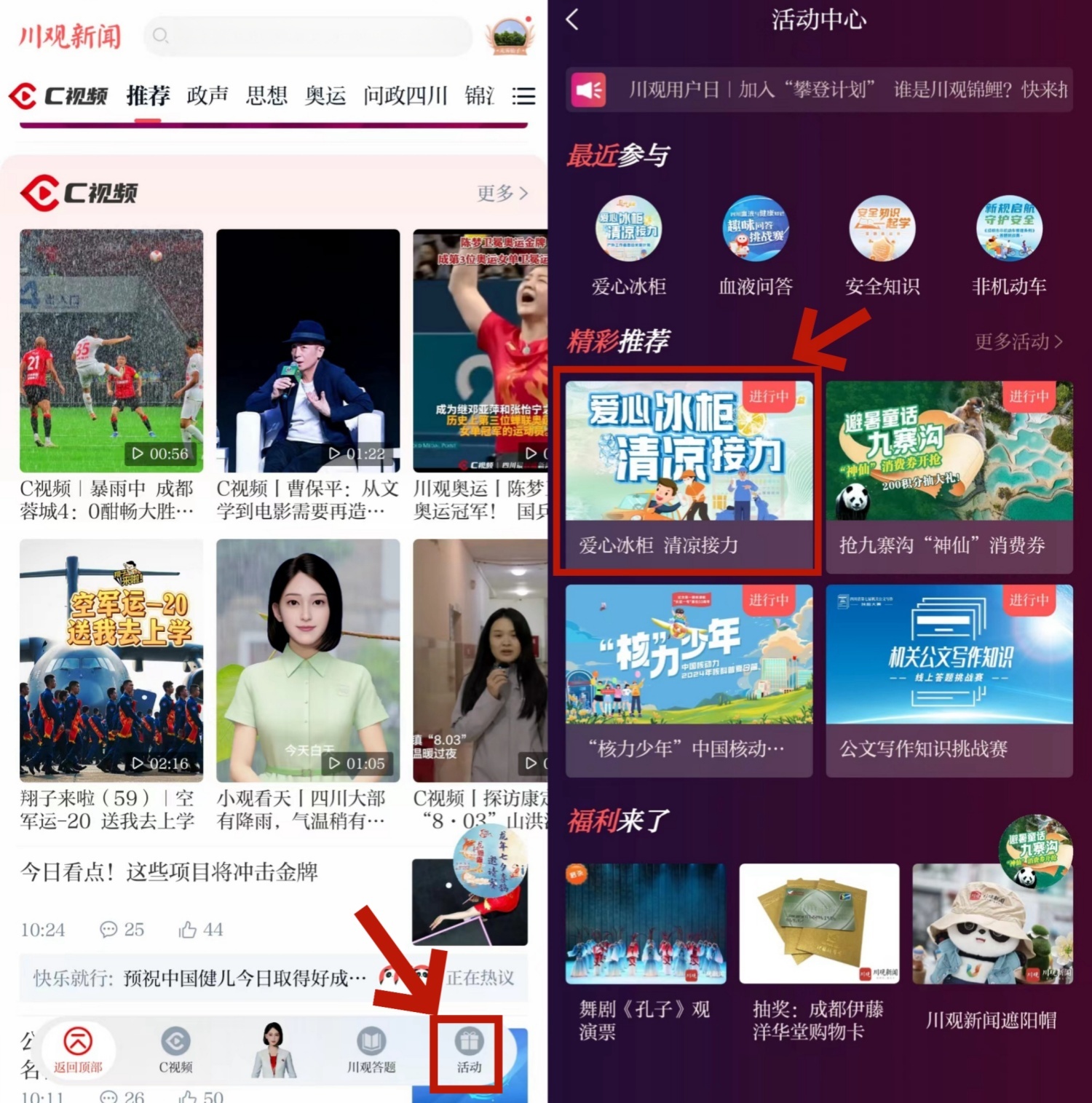 第二步:在川观新闻首页,点击“活动”,找到 “爱心冰柜 清凉接力”活动图片,点击即可参与。