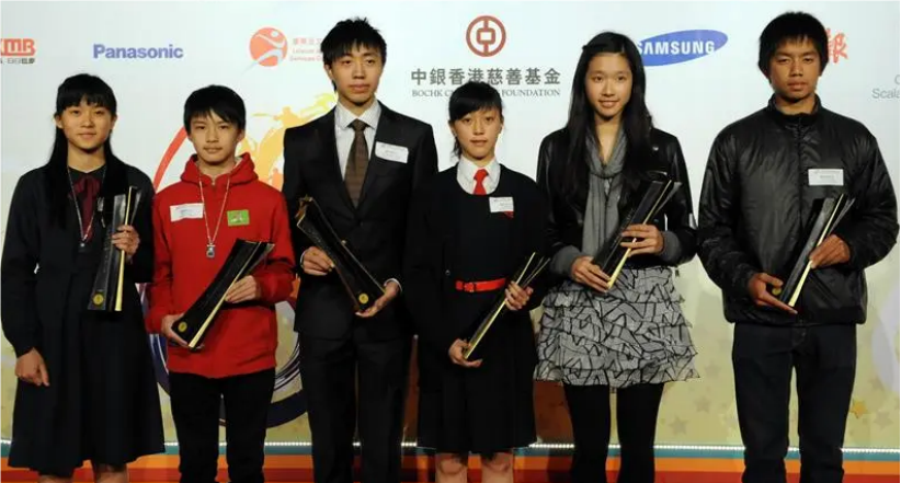 这是2011年2月21日,中国香港杰出运动员选举揭晓,江旻憓(右二)就在其中。新华社记者卢炳辉摄