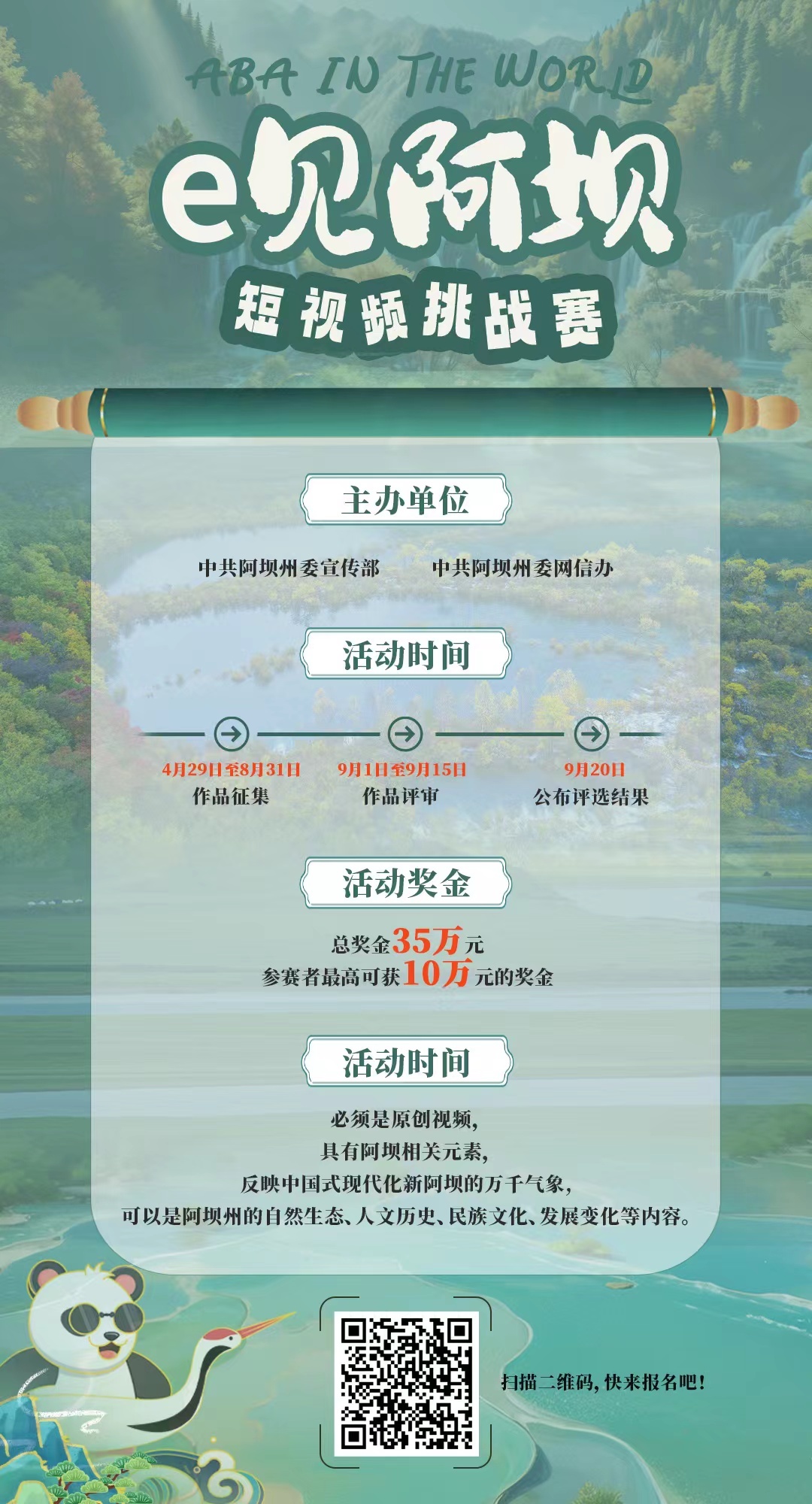 “e见阿坝”短视频挑战赛,由阿坝州委宣传部、阿坝州委网信办联合举办,目前正面向全网征集作品,征集时间至2024年8月31日结束。快来报名参赛吧!