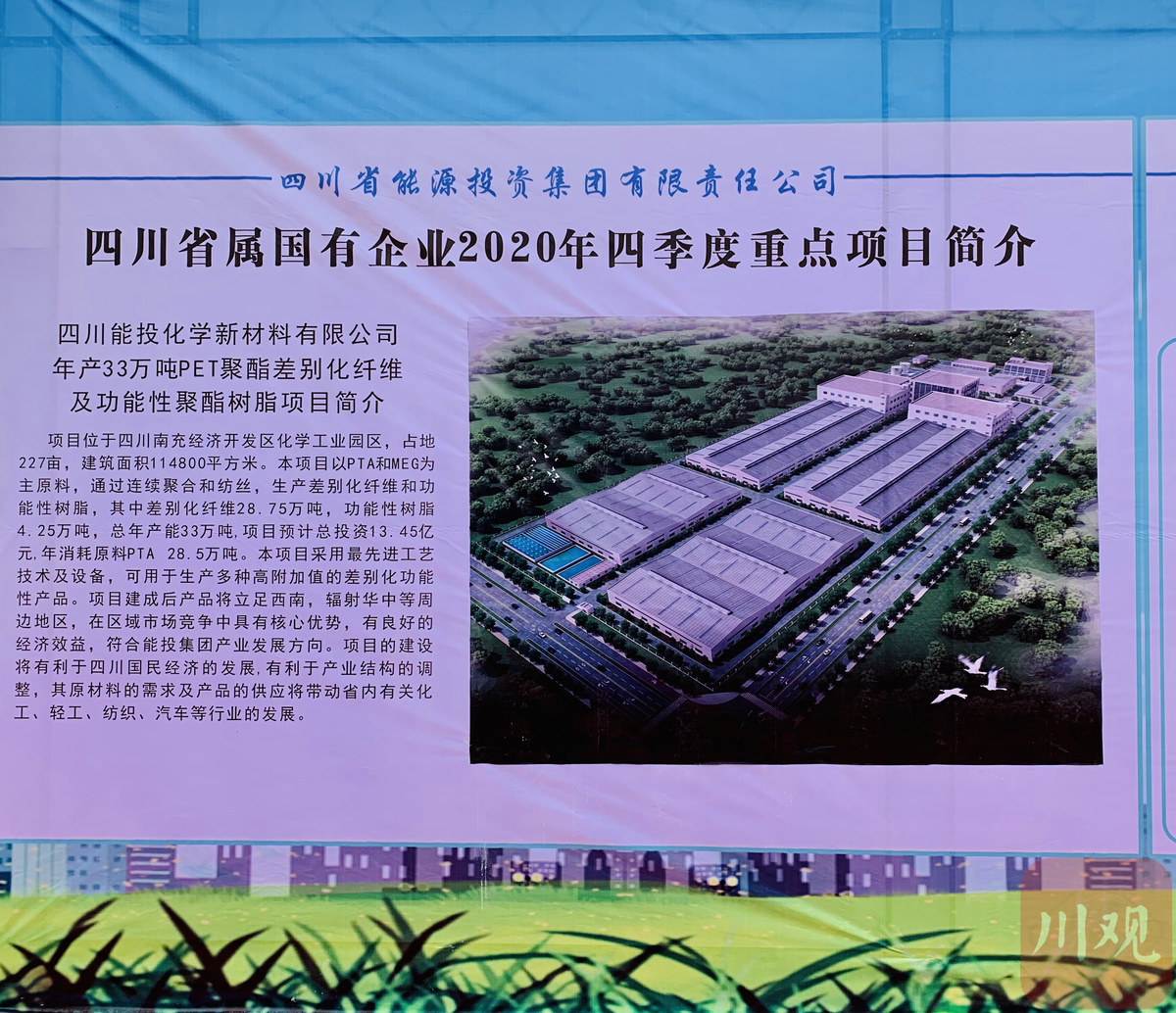 主会场项目,是四川能投集团下属的川能化学新材料公司年产33万吨PET聚酯差别化纤维及功能性聚酯树脂项目。该项目位于四川南充经济开发区化学工业园区,占地227亩,计划总投资约13.5亿元。主要以PTA(精对苯二甲酸)等为主原料,可生产多种高附加值的差别化、功能性产品,将有效填补西南地区该类型产品的空白。例如,可有效解决纺织领域聚酯纤维的抗起球、抗静电、阻燃难题等。
