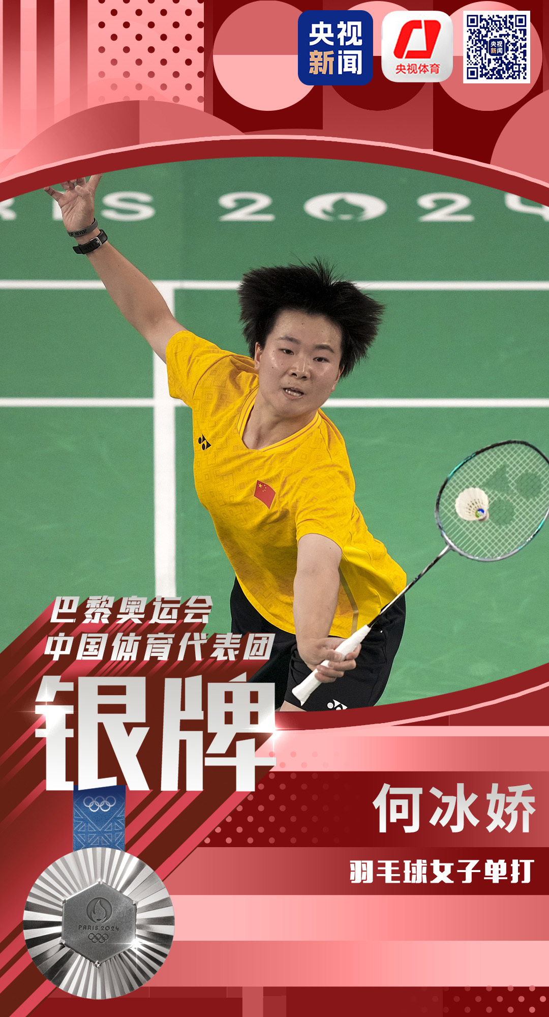 8月5日,在巴黎奥运会羽毛球女子单打决赛中,中国选手何冰娇获得银牌。