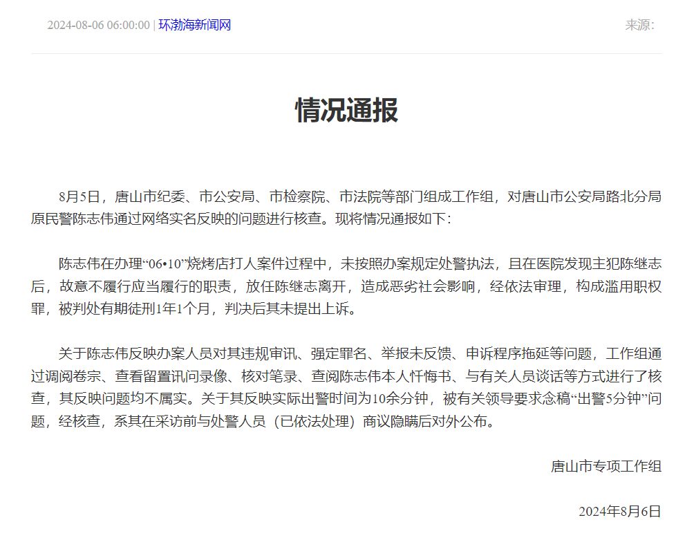8月5日,唐山市纪委、市公安局、市检察院、市法院等部门组成工作组,对唐山市公安局路北分局原民警陈志伟通过网络实名反映的问题进行核查。现将情况通报如下:
