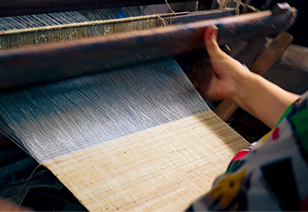 屋外骄阳似火,屋内阴凉通风。在织布工坊里,四五台木质手工织布机前,各坐着一位技艺娴熟的手艺人, 他们一边快速地左右丢梭完成纬线织入,一边双脚踩动踏板控制经线移动,经纬线交合形成一匹不断伸展的、宽一尺余的米白色布匹。