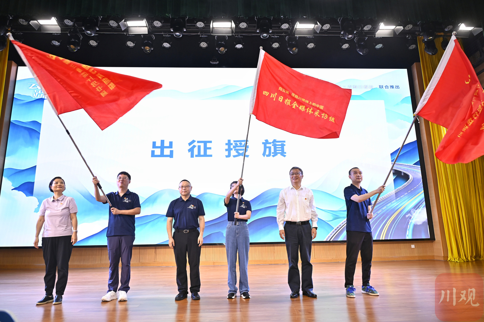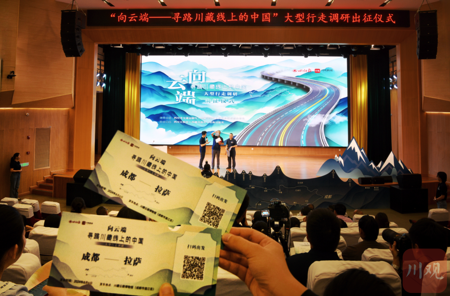 入场时,现场嘉宾均领取到了一张特殊的“车票”。出征仪式上,随着大家用手机扫描副券上的二维码进行“充电”,与会领导在大屏幕上按下“超充键”,此次大型行走调研报道“满电出发”。授旗仪式后,“向云端——寻路川藏线上的中国”大型行走调研报道正式启动。