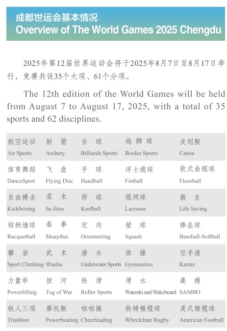 成都世运会是第十二届世界运动会,共设35个竞赛大项、61个分项。其中,既有成都市民“拿手”的飞盘、台球、轮滑等项目,也有很新鲜的无人机竞速、滑水等项目。
