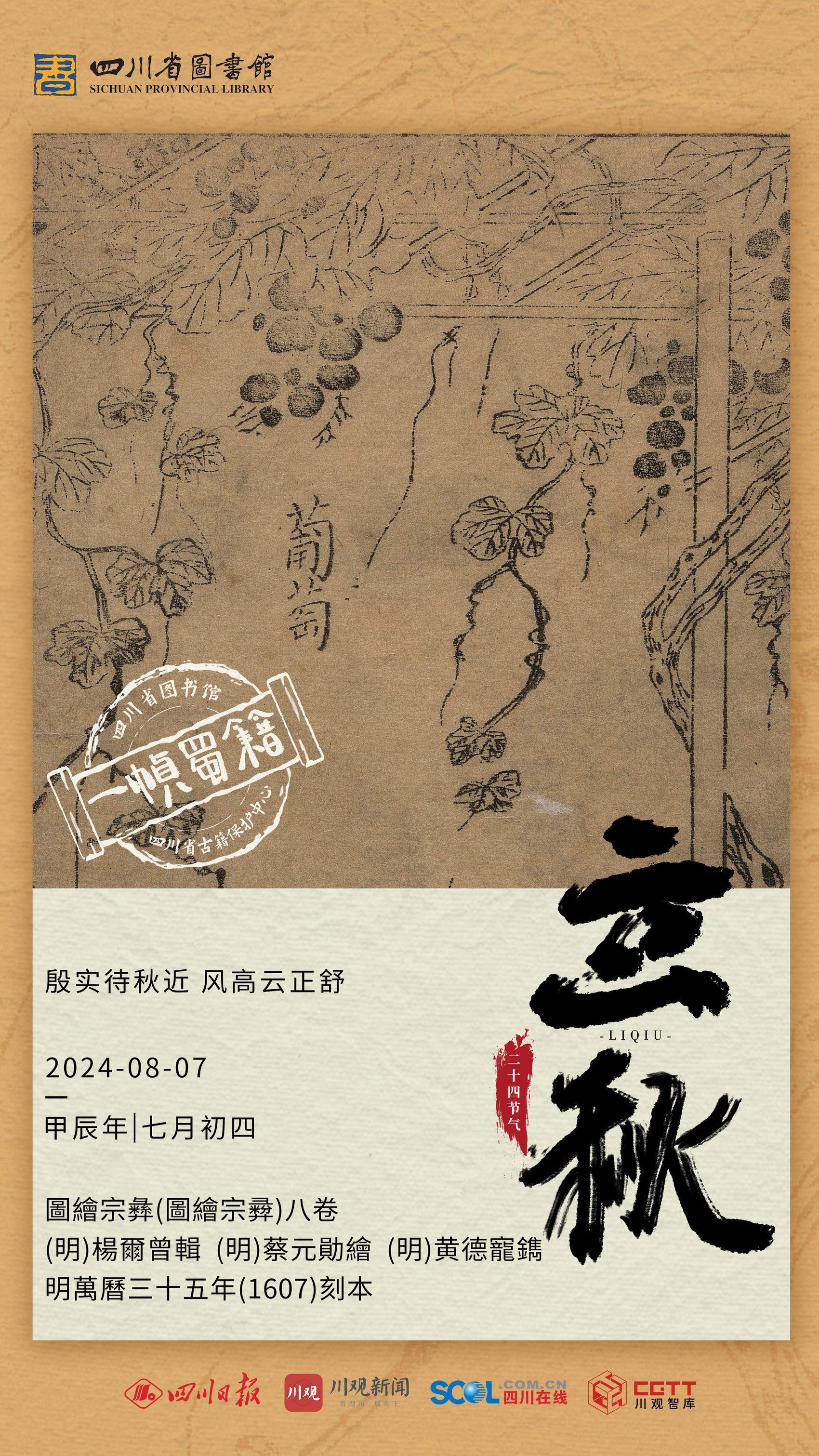 “云天收夏色,木叶动秋声。”8月7日,立秋,一帧蜀籍邀你看风高云正舒。海报所选用图为图绘宗彝(图绘宗彝)八卷 (明)杨尔曾辑 (明)黄德宠刻 明万历三十五年(1607)刻本。