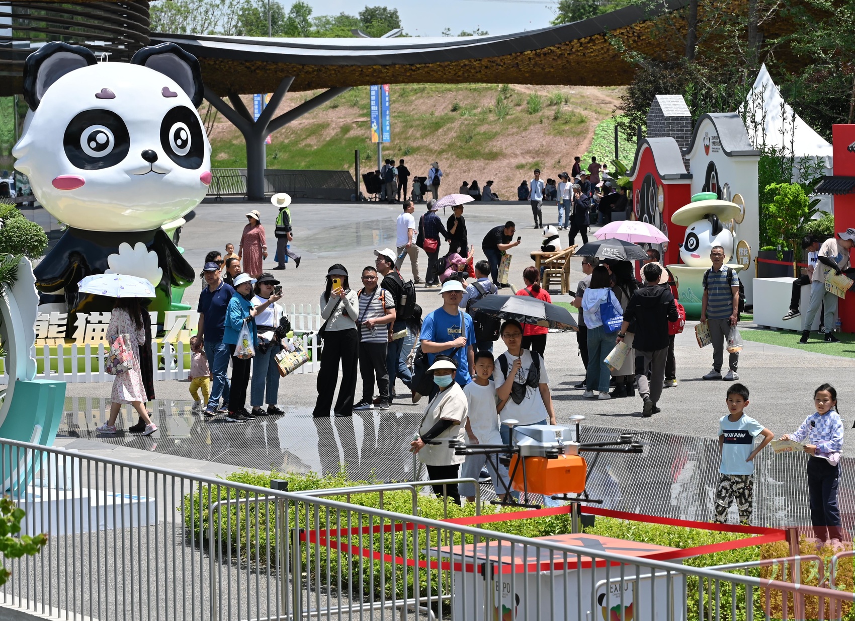 5月4日,在2024成都世园会主会场蓉城时光街旁的无人送餐点,无人机按照设定的航线将游客的外卖送达。