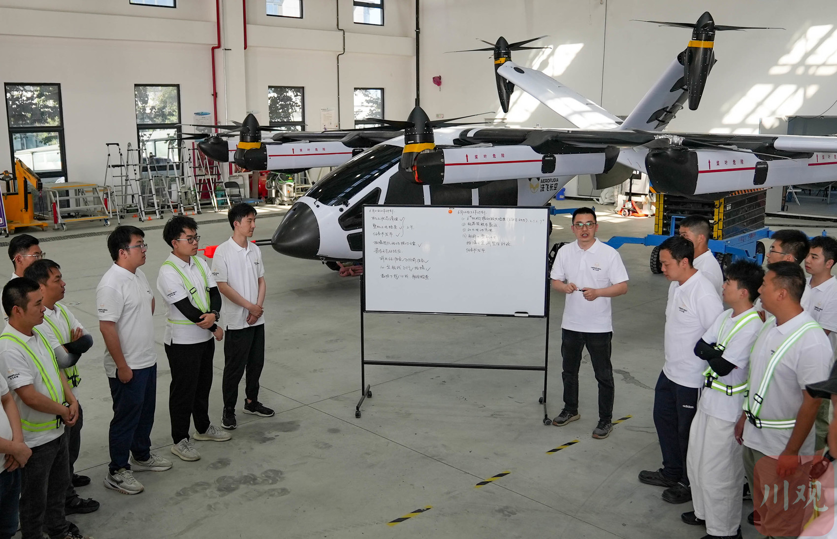 6月22日,“四川造”倾转旋翼飞行汽车eVTOL AE200公开试飞前一天,工作人员正参加飞行前任务书发布会,以保证试飞万无一失。