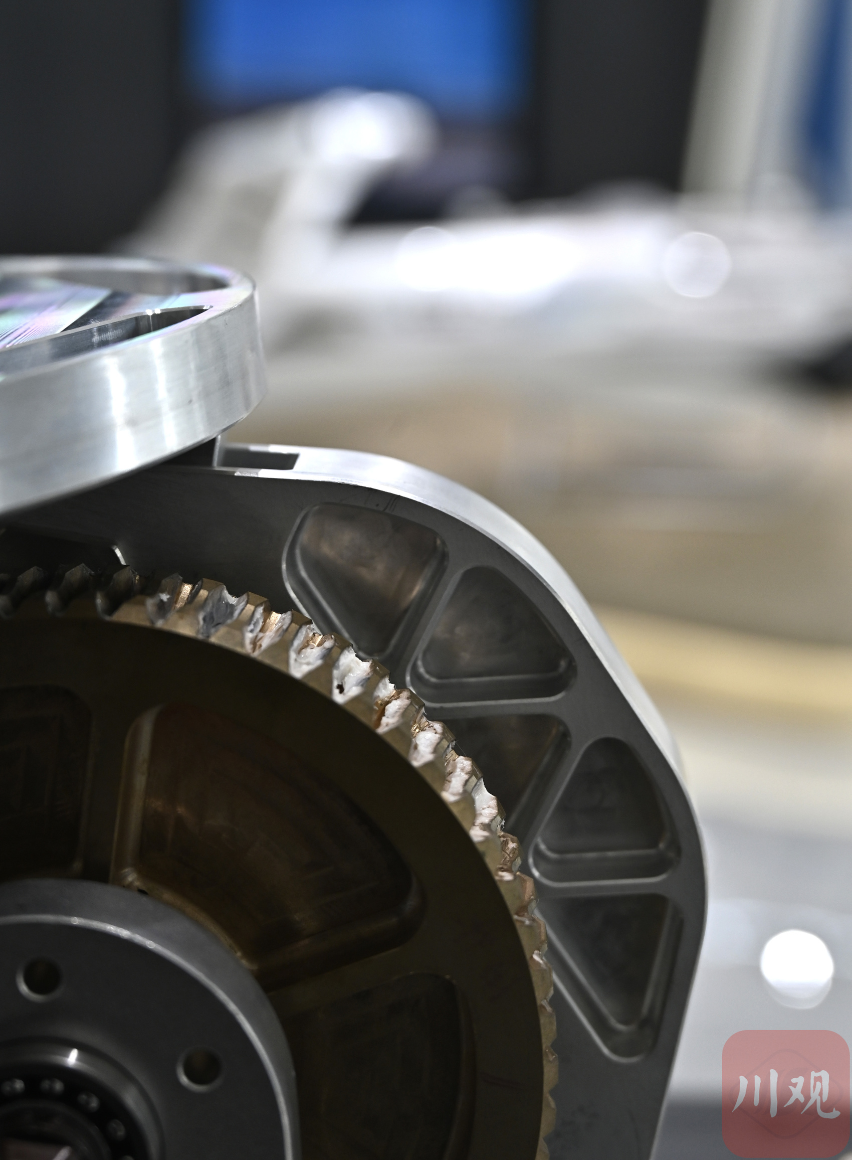 8月2日,在成都高新区沃飞长空全球总部拍摄的其拥有自主知识产权的全倾转机构的齿轮,这项技术实现了载人无人机角度控制更精细。
