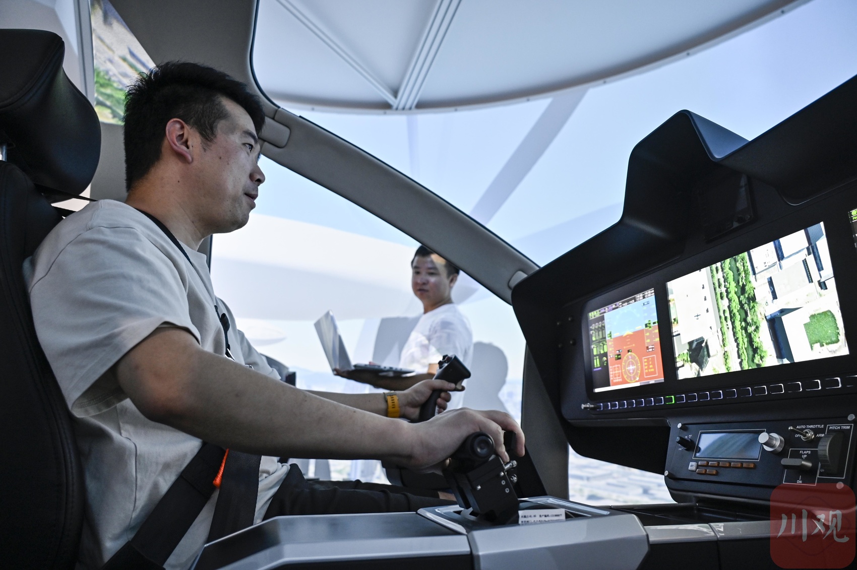 8月2日,在成都高新区沃飞长空全球总部,AE200型“飞行汽车”的工作人员正在模拟舱内校验试飞数据。