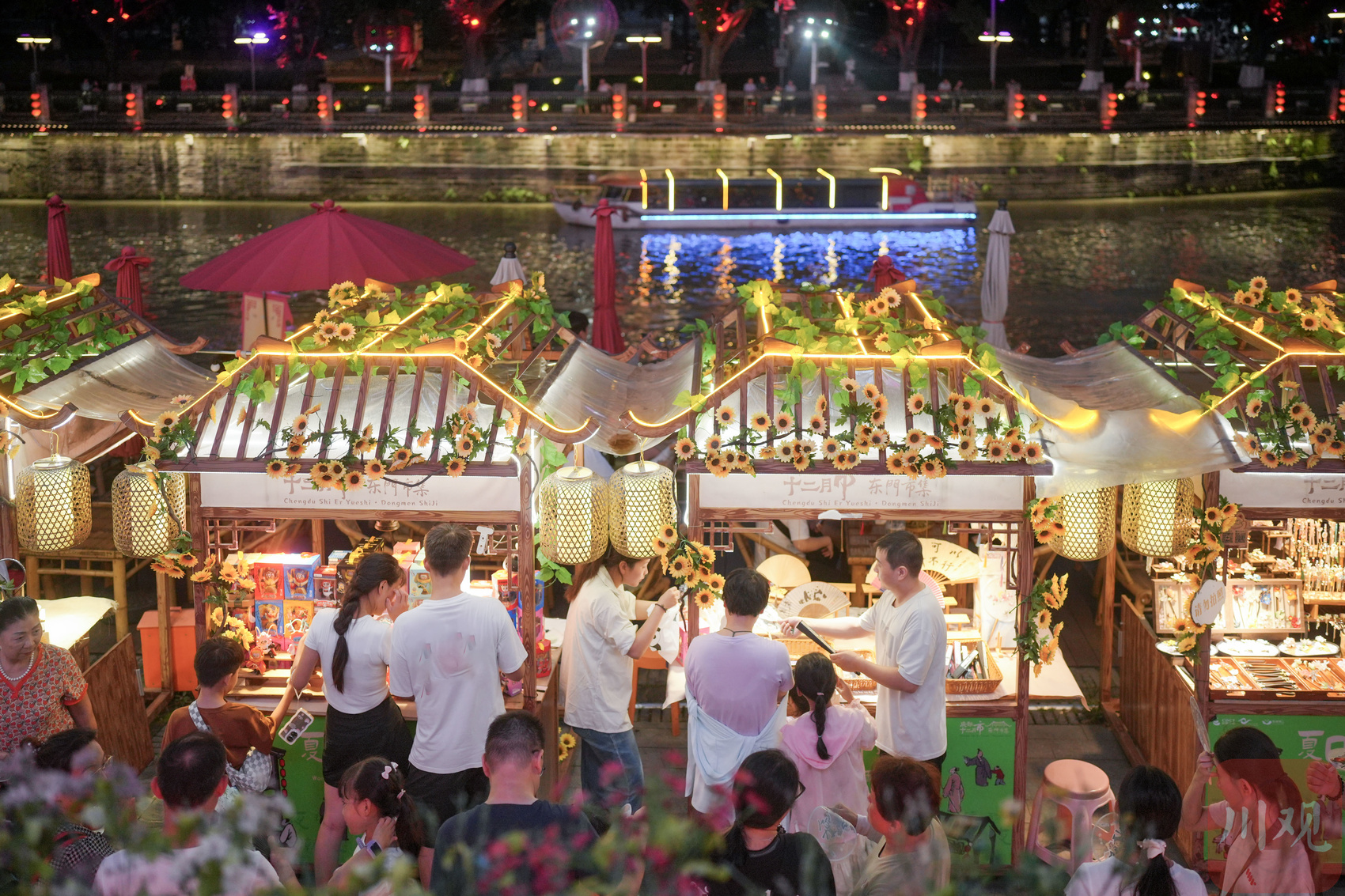 8月6日晚,灯火璀璨的锦江岸边,在成都市东门码头等待上船体验夜游锦江的游客排起了长队。随着暑期旅游高峰期的到来,到成都旅游的游客们纷纷前来体验特色“夜经济”。乘坐游船游锦江、在岸上喝茶品美食、逛特色夜市……多样化的夜游活动让人们既体验市井欢愉,觅得夏日清凉,又感受了城市发展的脉动。