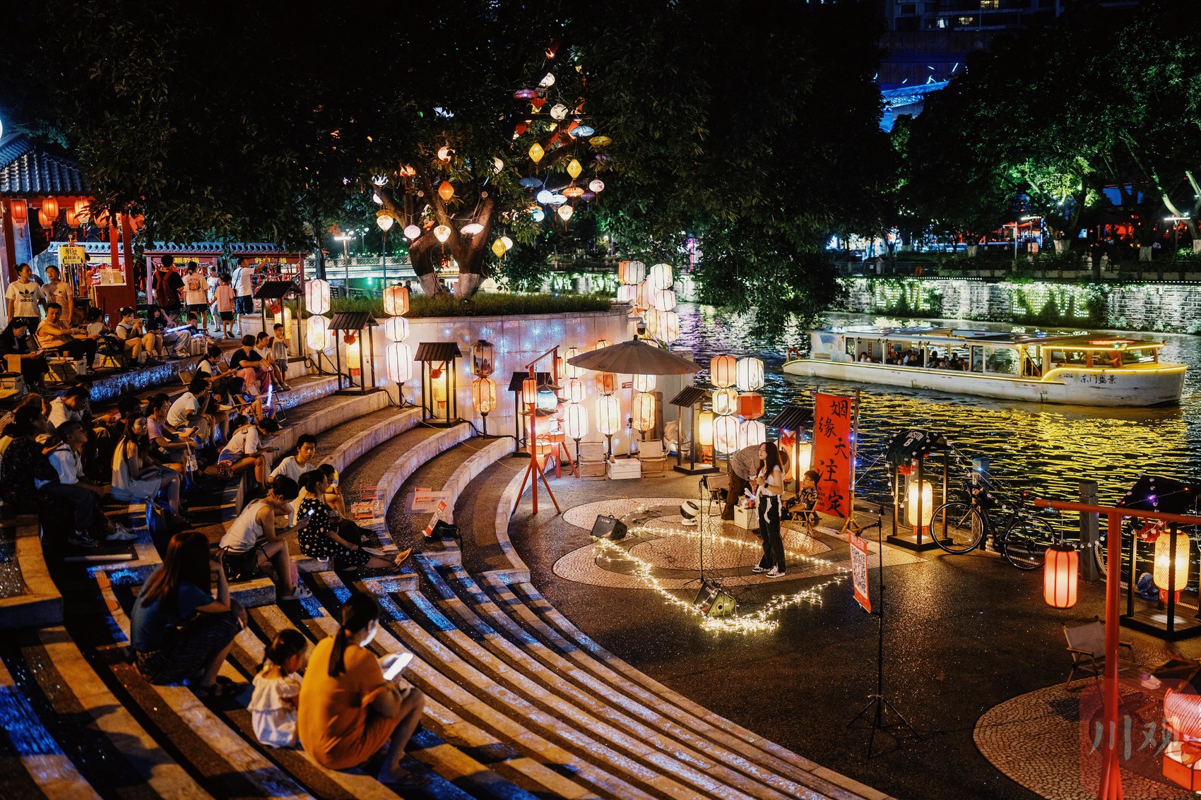 游船在锦江夜游,与岸上的听歌纳凉的市民成为新场景。