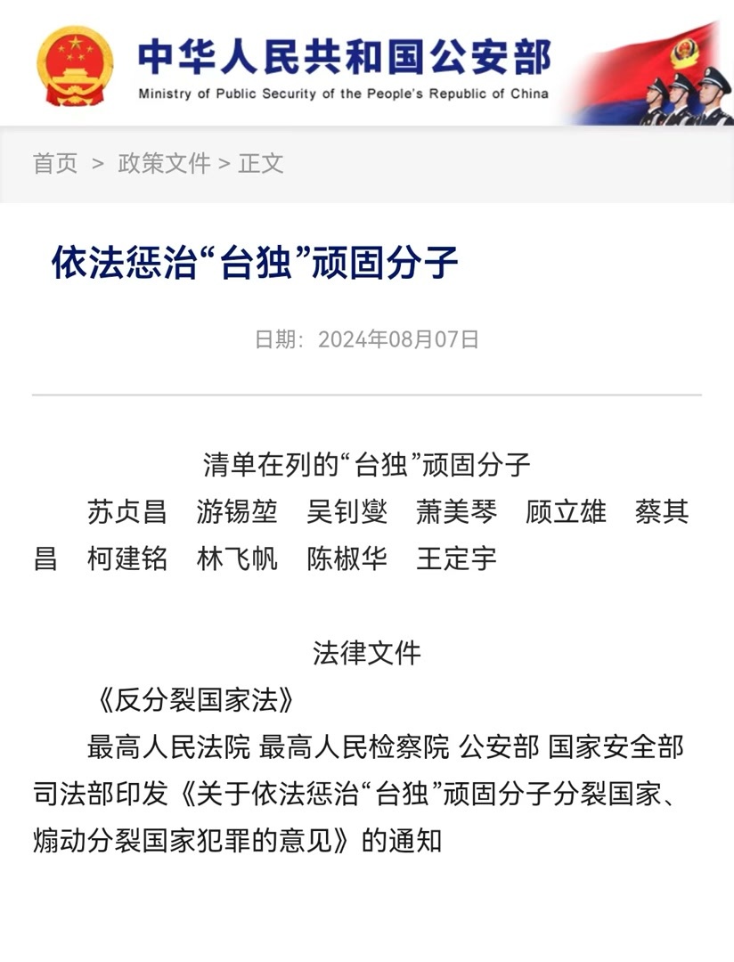 8月7日,北京日报客户端记者注意到,国务院台办网站新增了“依法惩治‘台独’顽固分子”专栏。公安部政府网站也新增了“依法惩治‘台独’顽固分子”专栏。