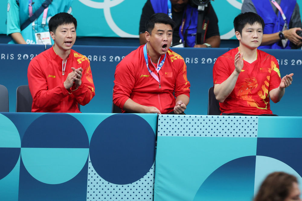↑中国队运动员马龙、教练员王皓、运动员樊振东(从左至右)在场边加油助威。