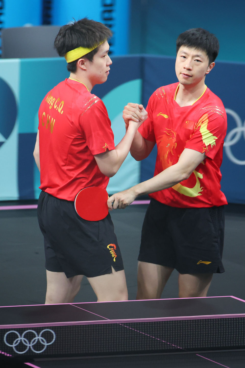 ↑中国组合马龙(右)/王楚钦在比赛中。他们3比0战胜韩国组合赵大成/张禹珍。
