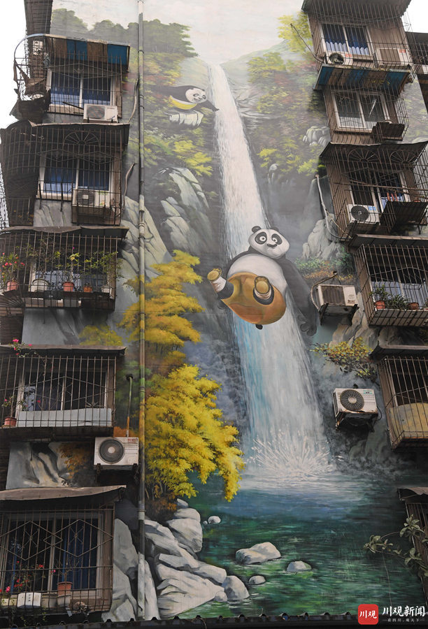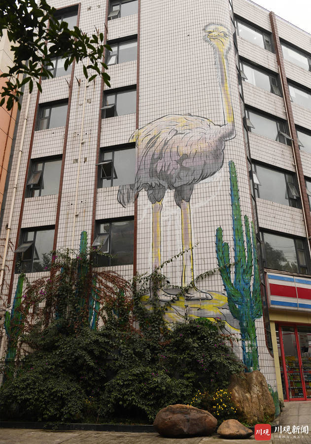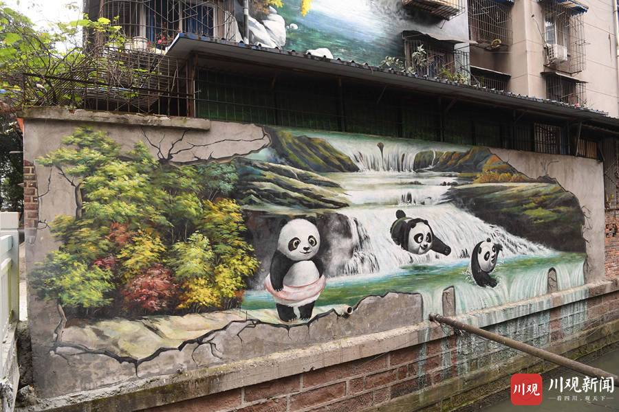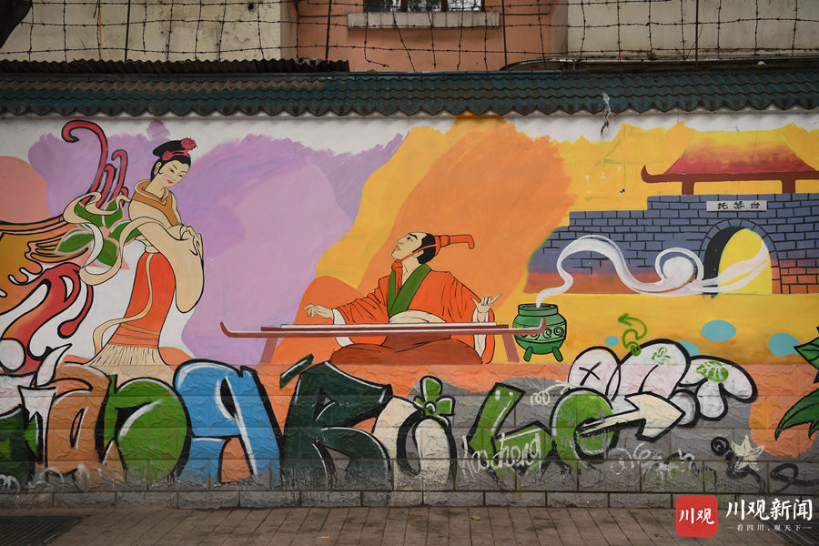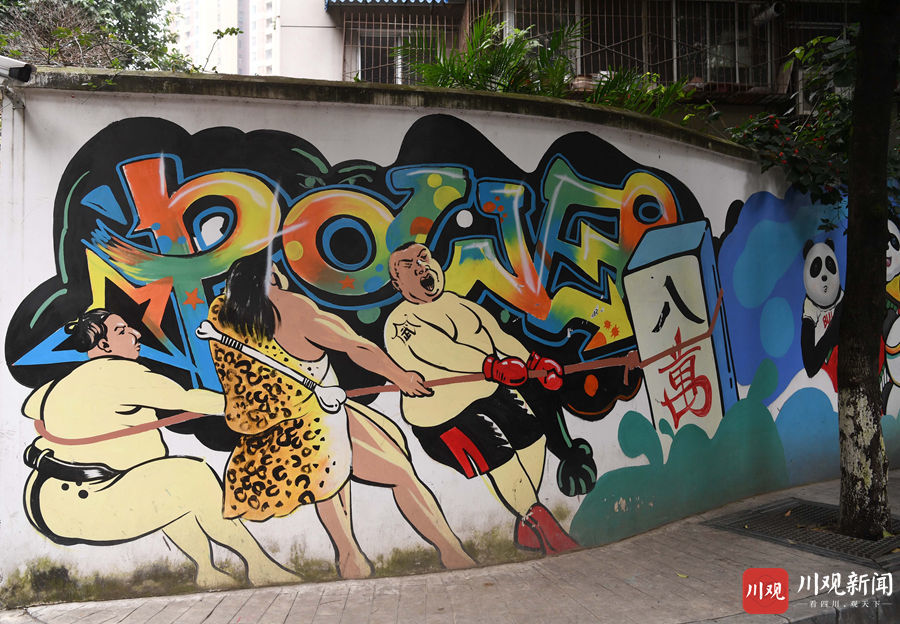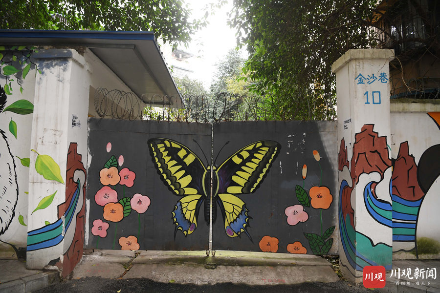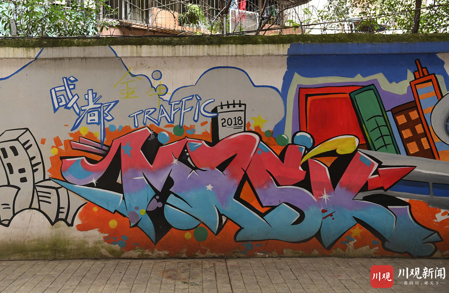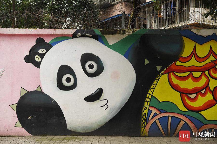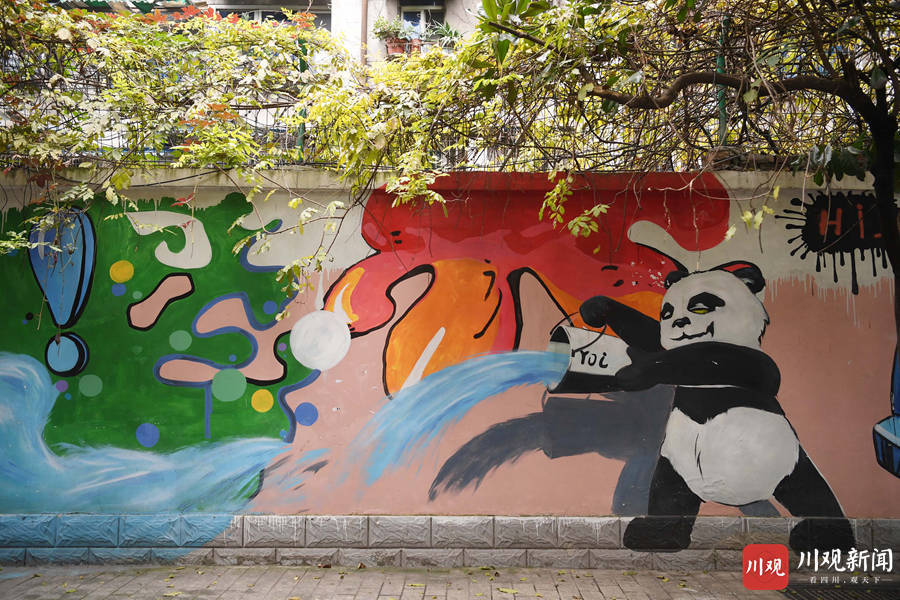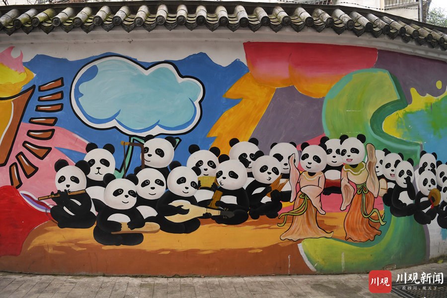 这条近800米长的金沙巷涂鸦墙上,除了绘有近百只造型各异的卡通大熊猫,还有愤怒的小鸟、爱音乐的时尚青年画像群、西域的驼队商人等形象,彩色艳丽,栩栩如生,格外抢眼。金沙巷涂鸦墙各种脑洞大开的创作元素和历史韵味,让它很快晋升为成都的网红打卡地。
