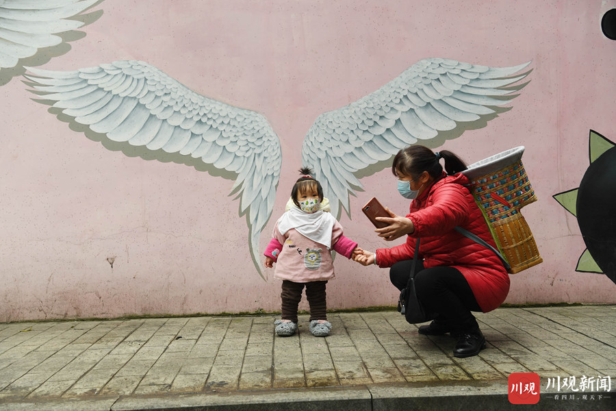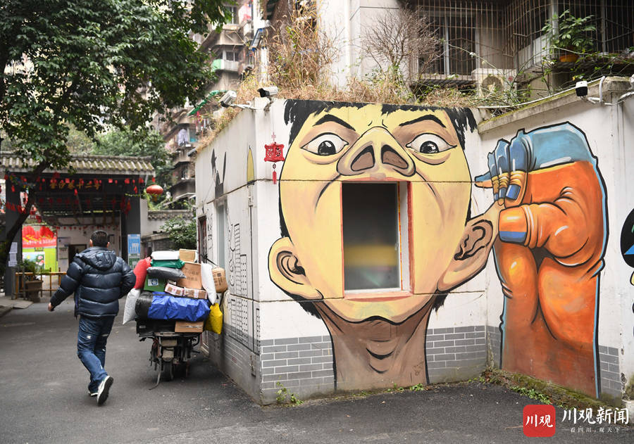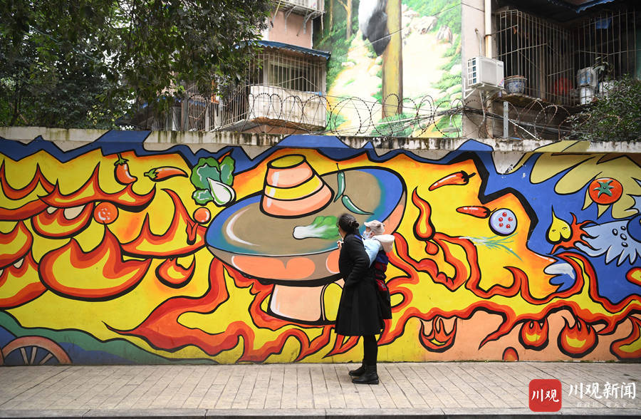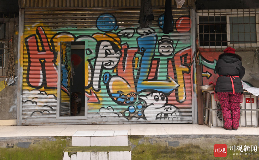 12月16日,成都市金牛区金沙巷涂鸦一条街上,来此打卡的市民络绎不绝,他们一边观看墙上的涂鸦,一边掏出手机拍照发朋友圈。