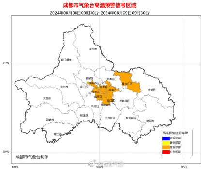 截至目前,成都市双流、彭州、新津已发布高温橙色预警信号,其余各区(市)县将根据气温发展情况适时发布。