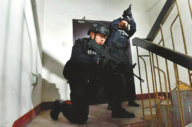 在居民楼,特警实行强攻,在连续撞开几道门并即将撞开最后一道卧室门时,突然,一名光头人员用枪抵着一名女性的头部出现在特警视野中。特警队员不敢擅自行动,李建华第一时间向指挥部报告了情况。
