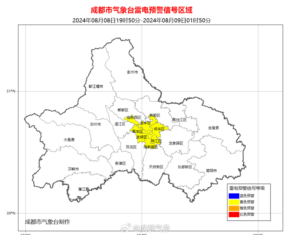 成都市气象台2024年08月08日19时50分发布雷电黄色预警信号: