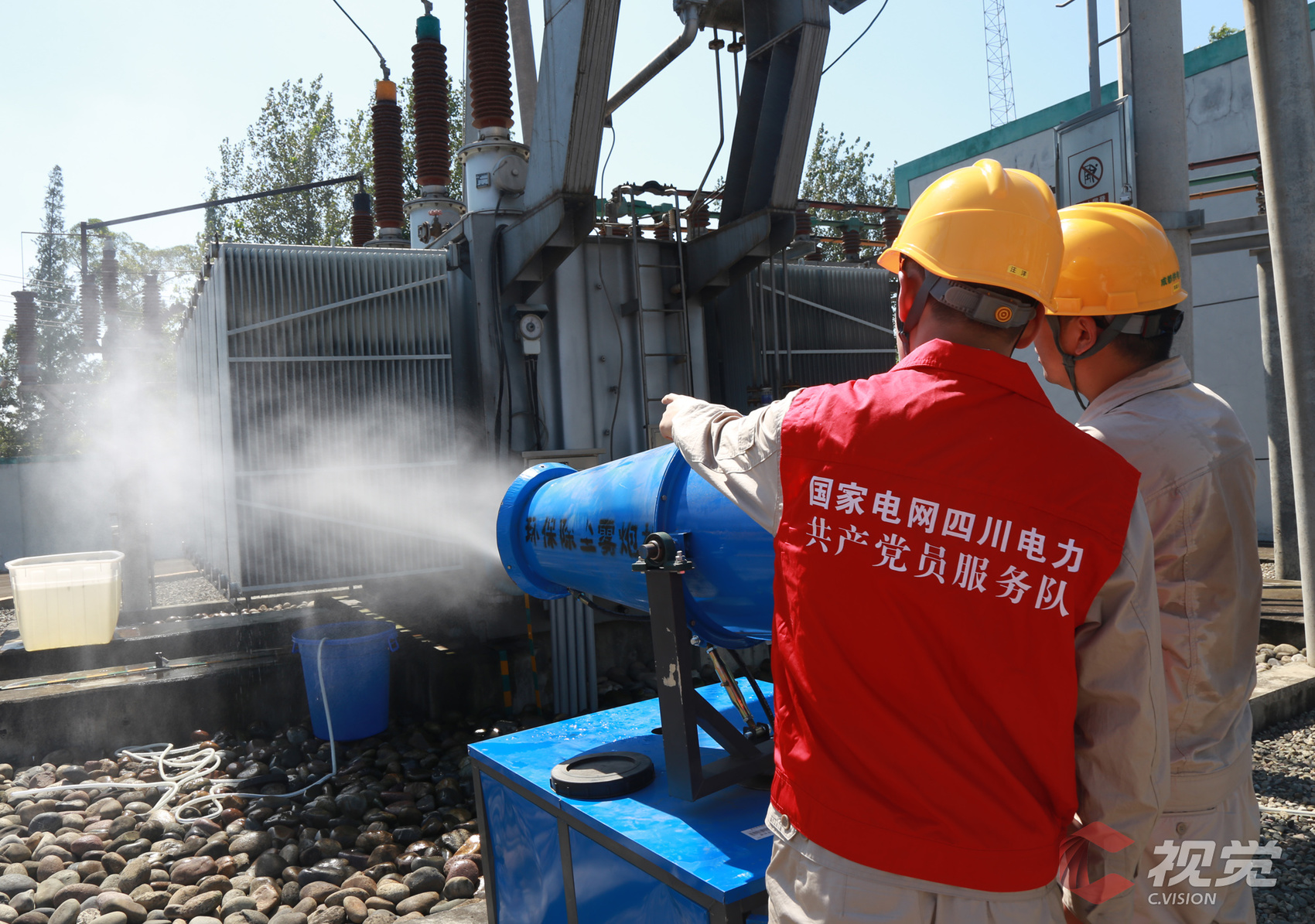 8月6日,国网四川电力(成都新津)连心桥共产党员服务队在110千伏文武变电站对2号主变运用雾炮机开展喷淋、降温。